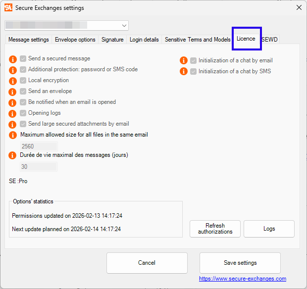 This tab groups together the technical settings related to the connection and the license.