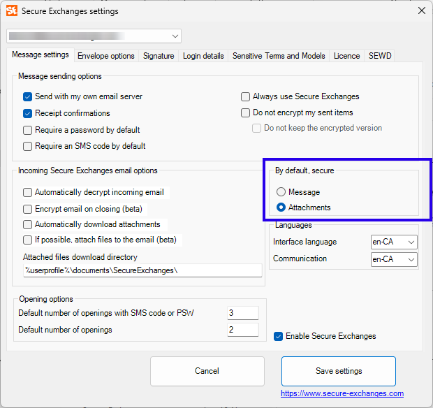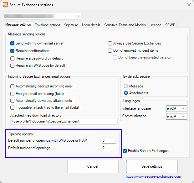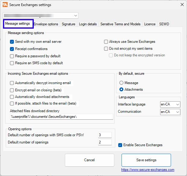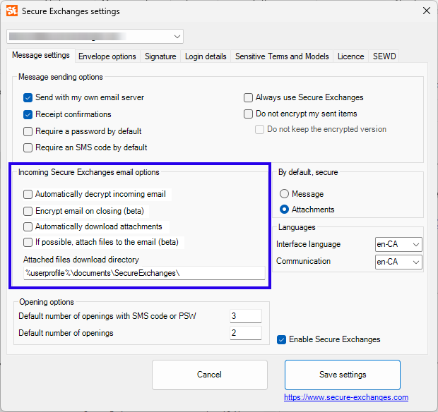 This tab allows you to define the default behavior of secure emails, both for sending and receiving.