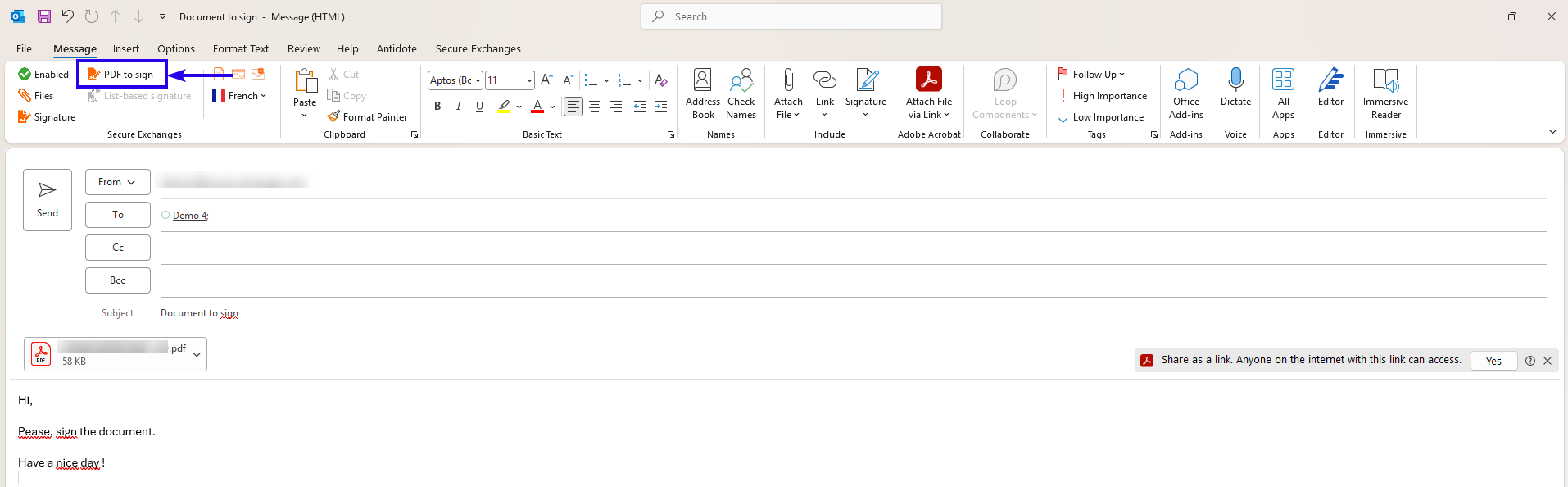 Sign a document in Microsoft Outlook using Secure Exchanges