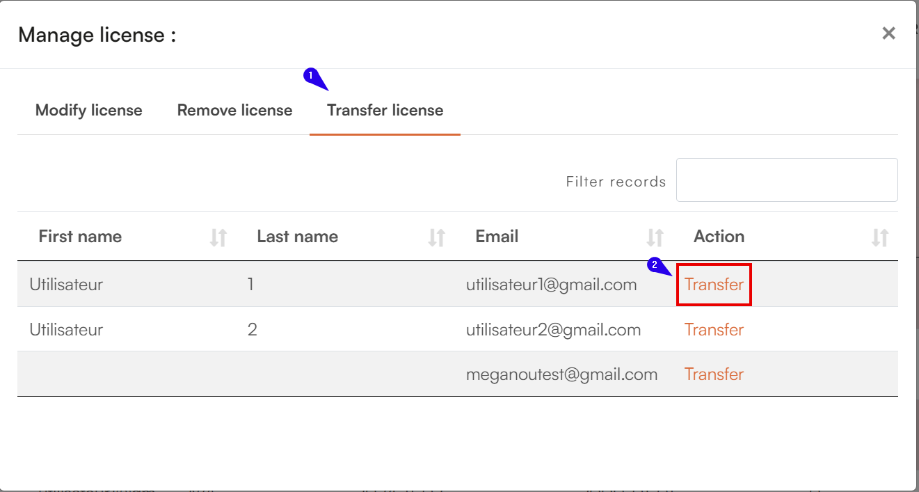 Click Transfer beside the desired user.