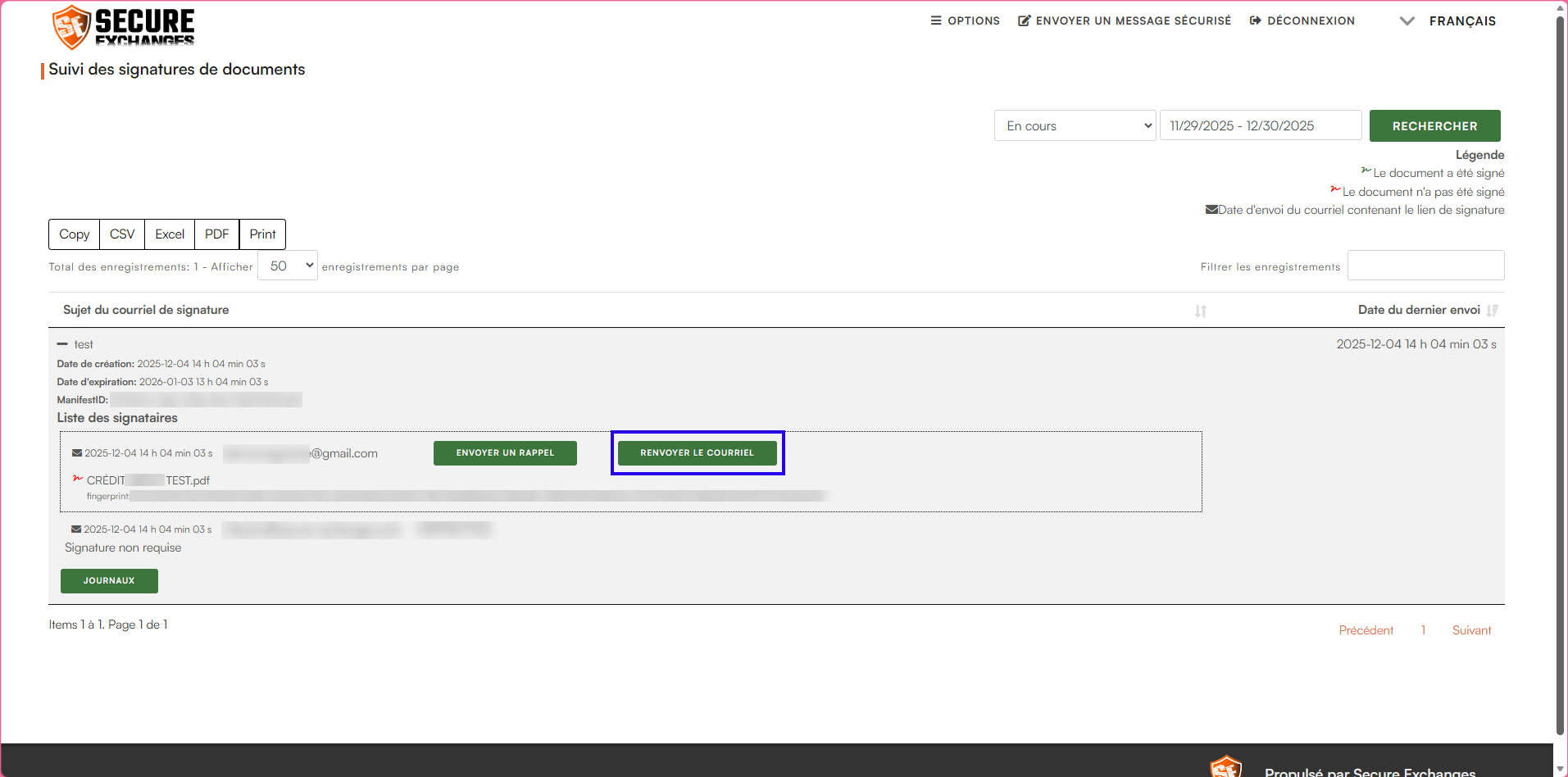 The " Resend email" button allows you to generate a new signature link from the copy of the document archived in your SESAR.