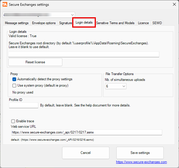 This tab contains technical settings related to connection and licensing.