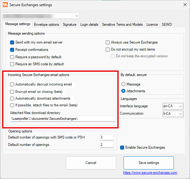 This tab defines the default behavior of secure emails, both for sending and receiving.