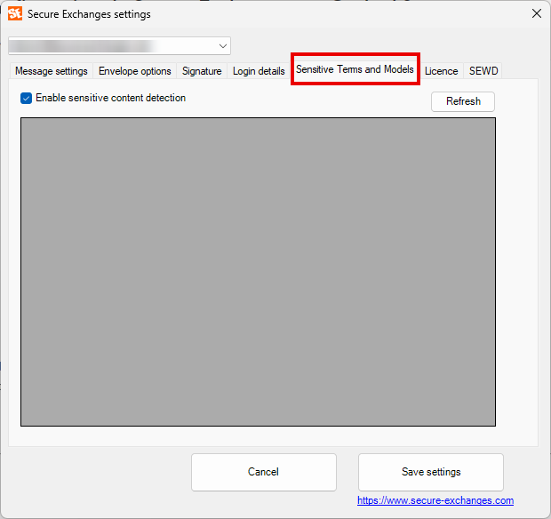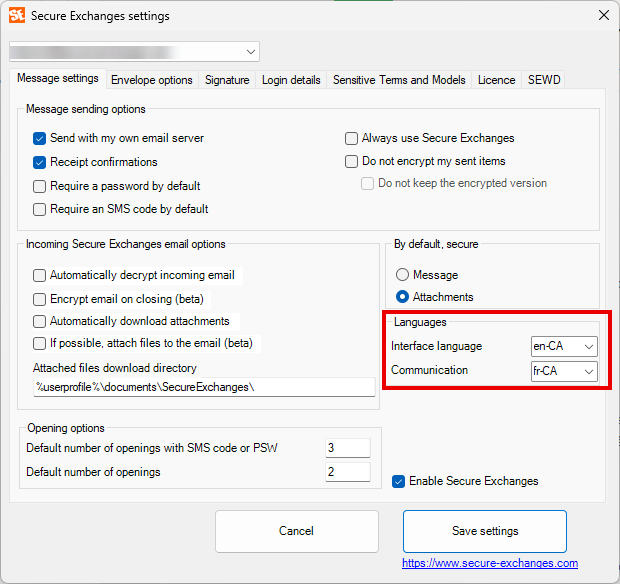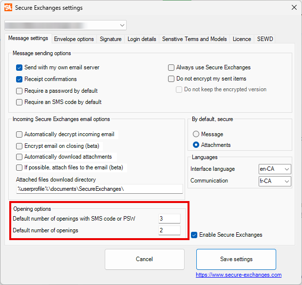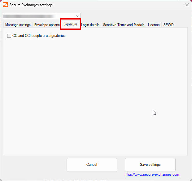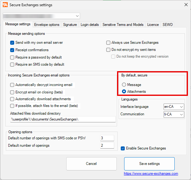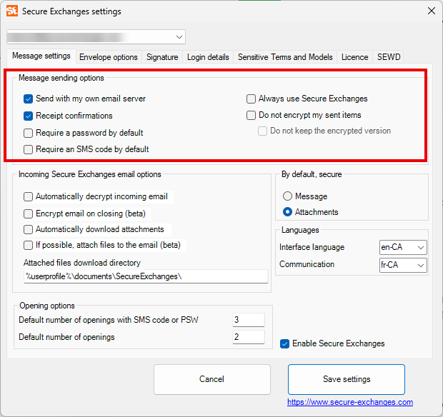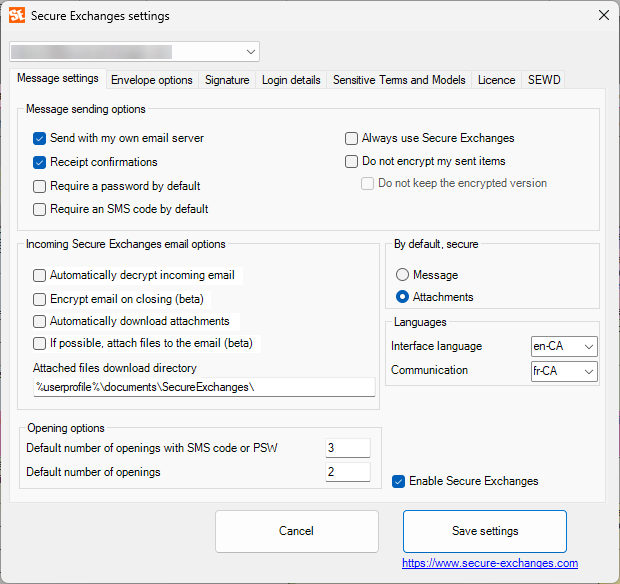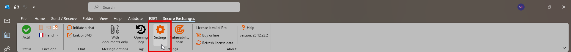 Accessing Secure Exchanges settings : In Outlook, click Secure Exchanges, then Settings.A window will open with several tabs, described below.