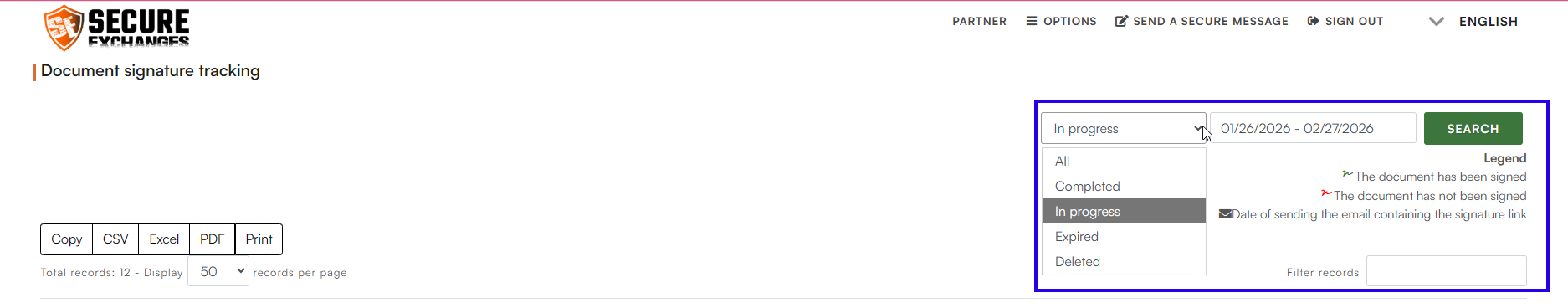 - Date range *Select the period for which you want to display your signature requests.