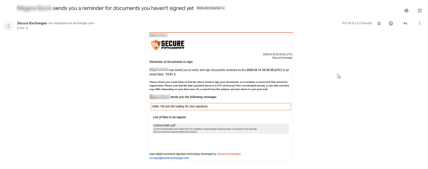 The signatory receives an email reminding them that a document is awaiting their signature.