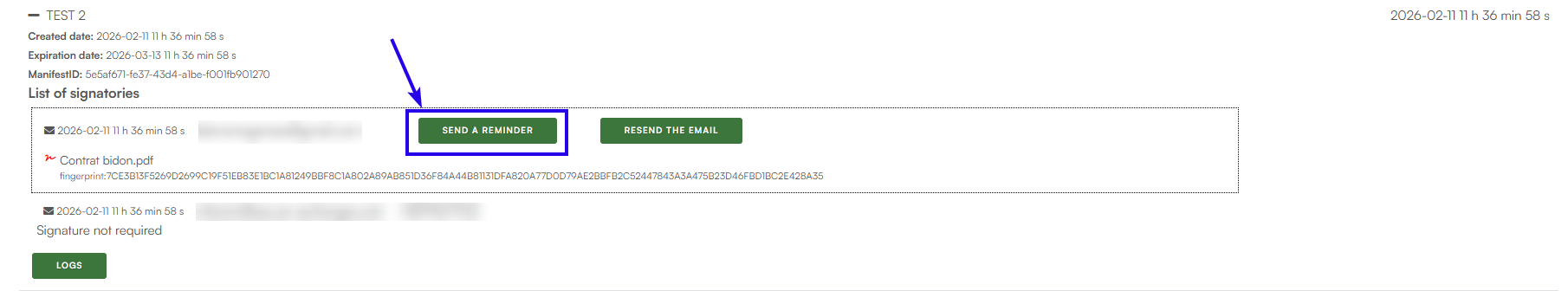 If a signer has not completed the signature, you can send them a reminder directly from this interface.