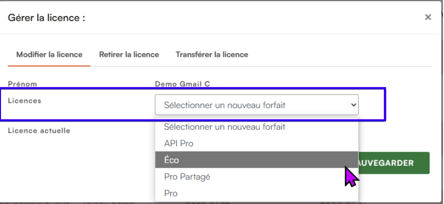 À la fin de la ligne, cliquez sur l’icône de "gestion de licence"