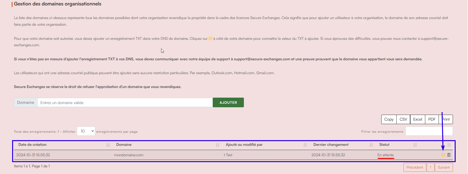 Avertissement Au bas de la page, votre domaine apparaîtra avec le statut « En attente d’approbation », vous devez suivre le reste des étapes pour l'approuver.