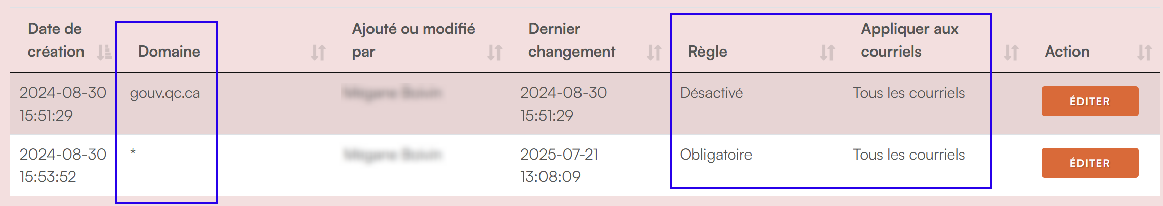 Entrez le domaine pour lequel vous souhaitez définir une règle (ex. : secure-exchanges.com, gouv.qc.ca, etc.).