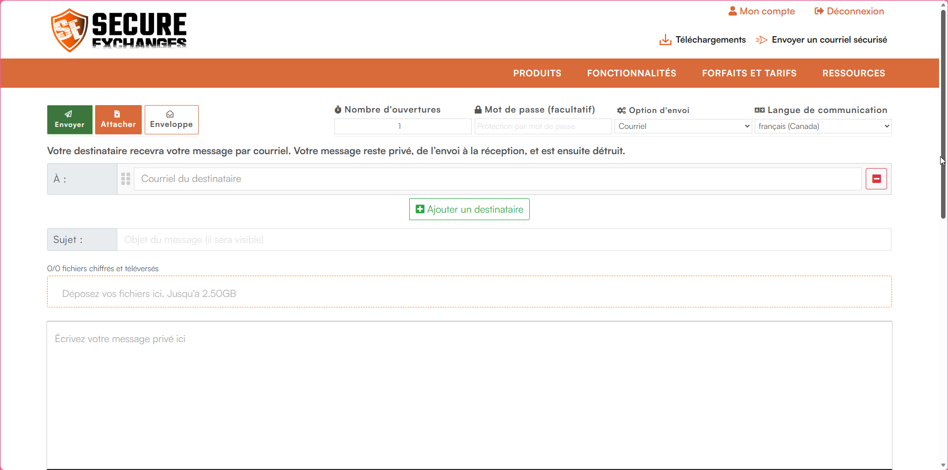 - Courriel + code par SMS *Votre destinataire recevra votre message par courriel et un code aléatoire par texto pour accéder au message.