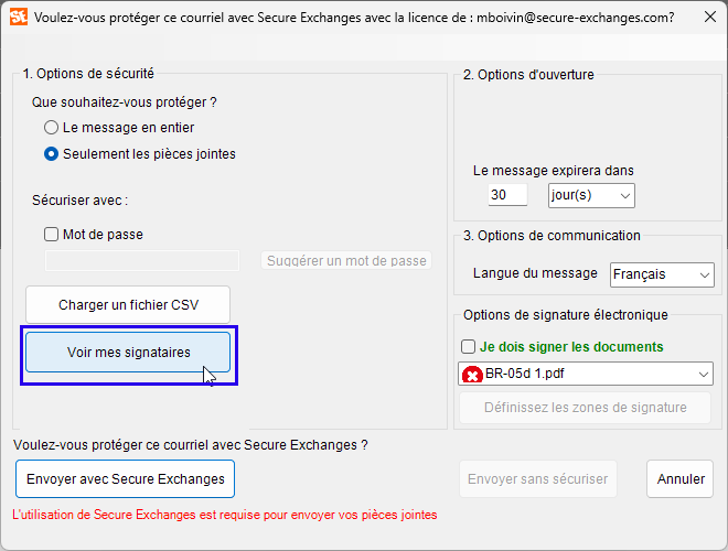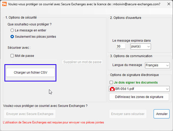 Vous remarquerez alors que le champ À est automatiquement remplacé par : csv@secure-exchanges.com. C’est normal : ce courriel sert uniquement à déclencher le processus de signature par liste.