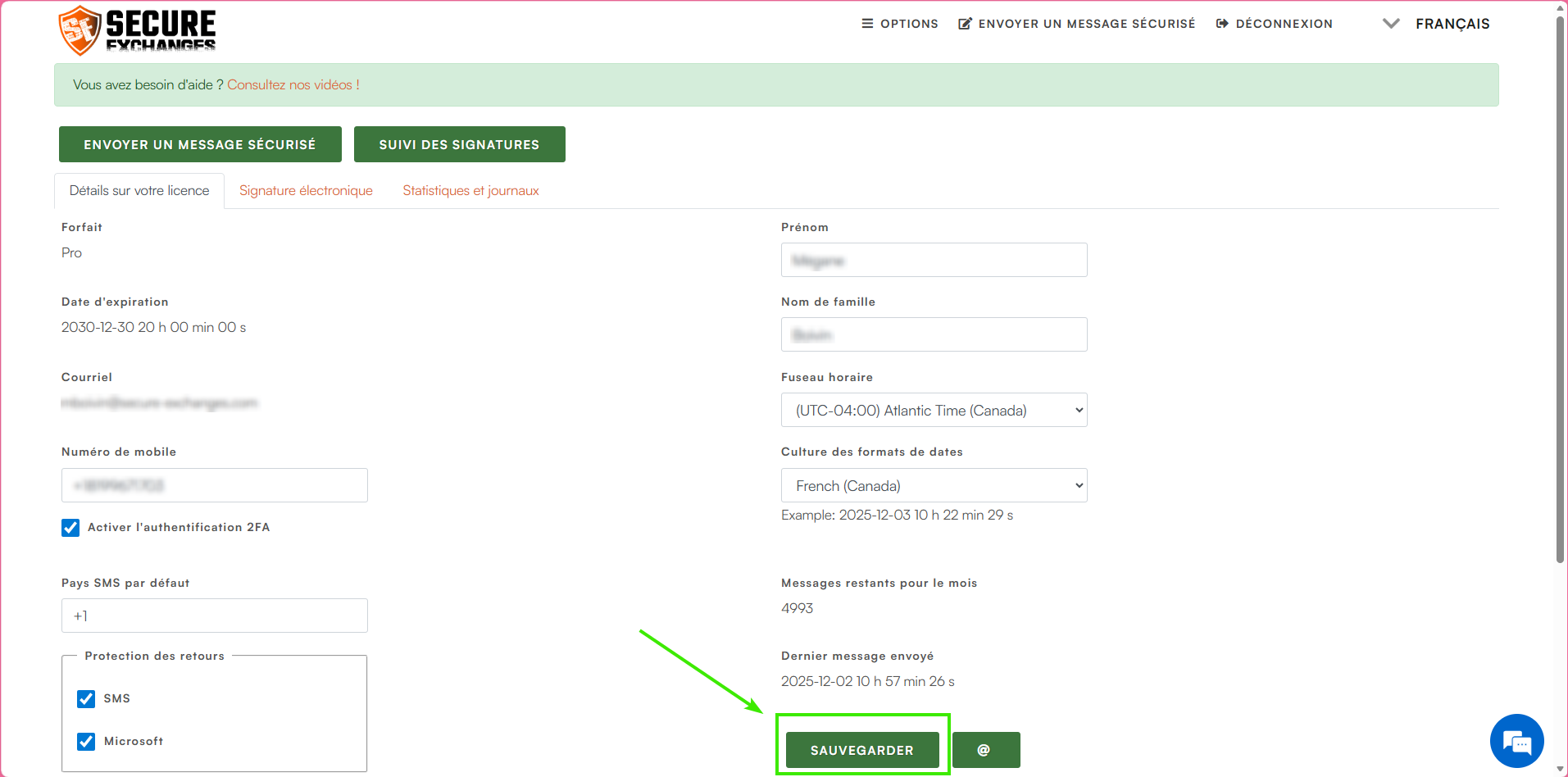 - Bouton “SAUVEGARDER” *Permet d’enregistrer tous les changements apportés dans votre compte.