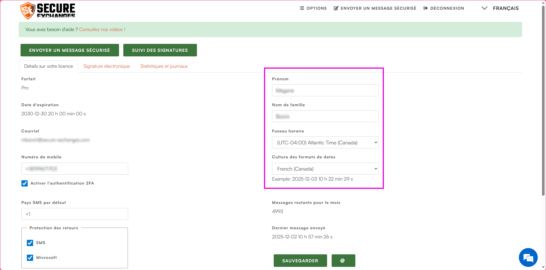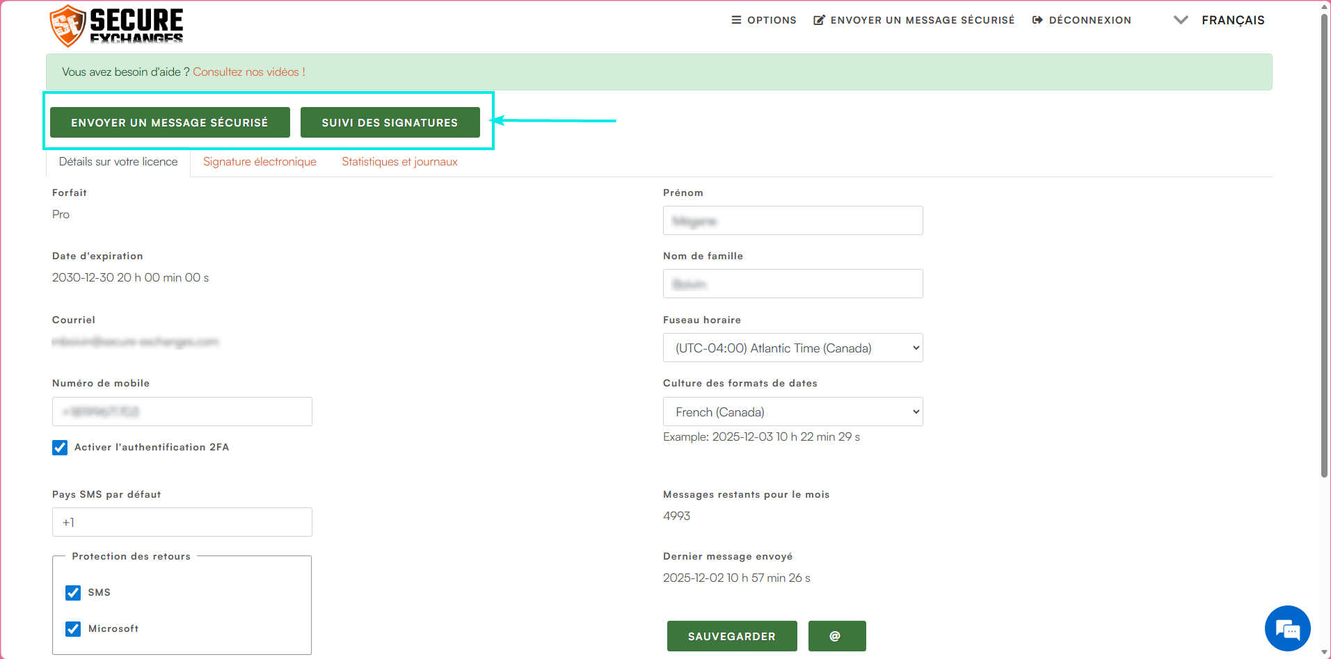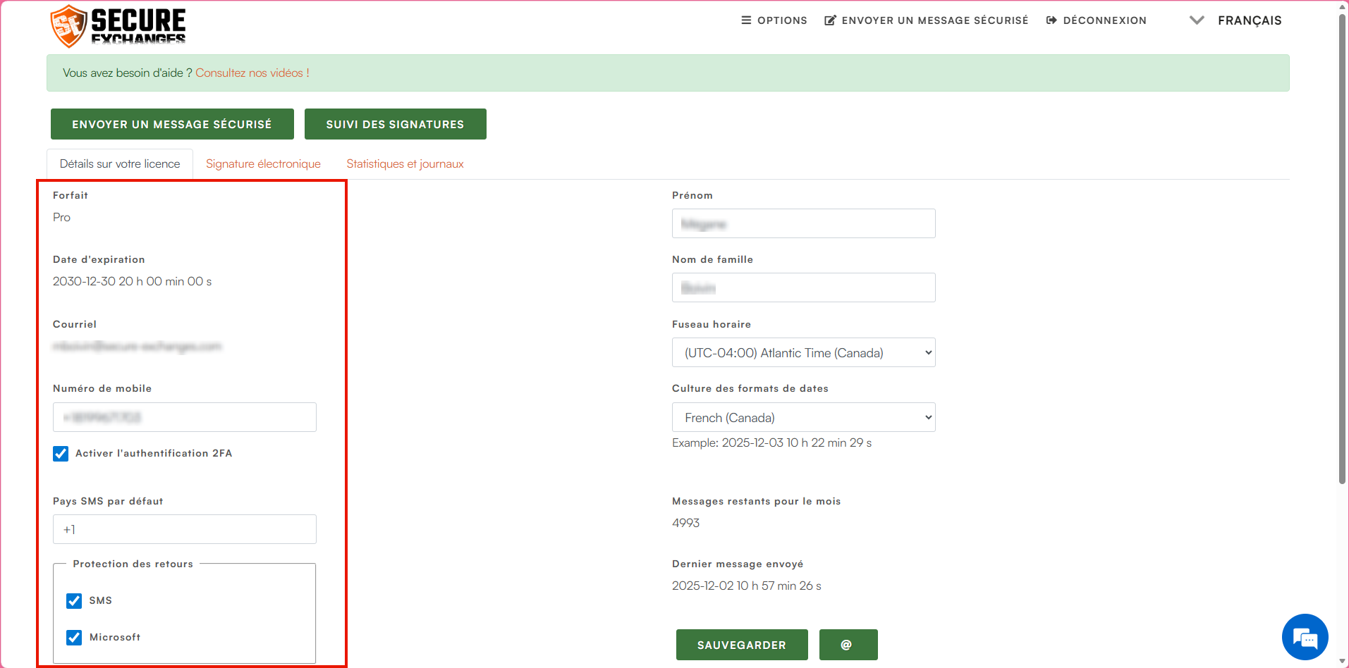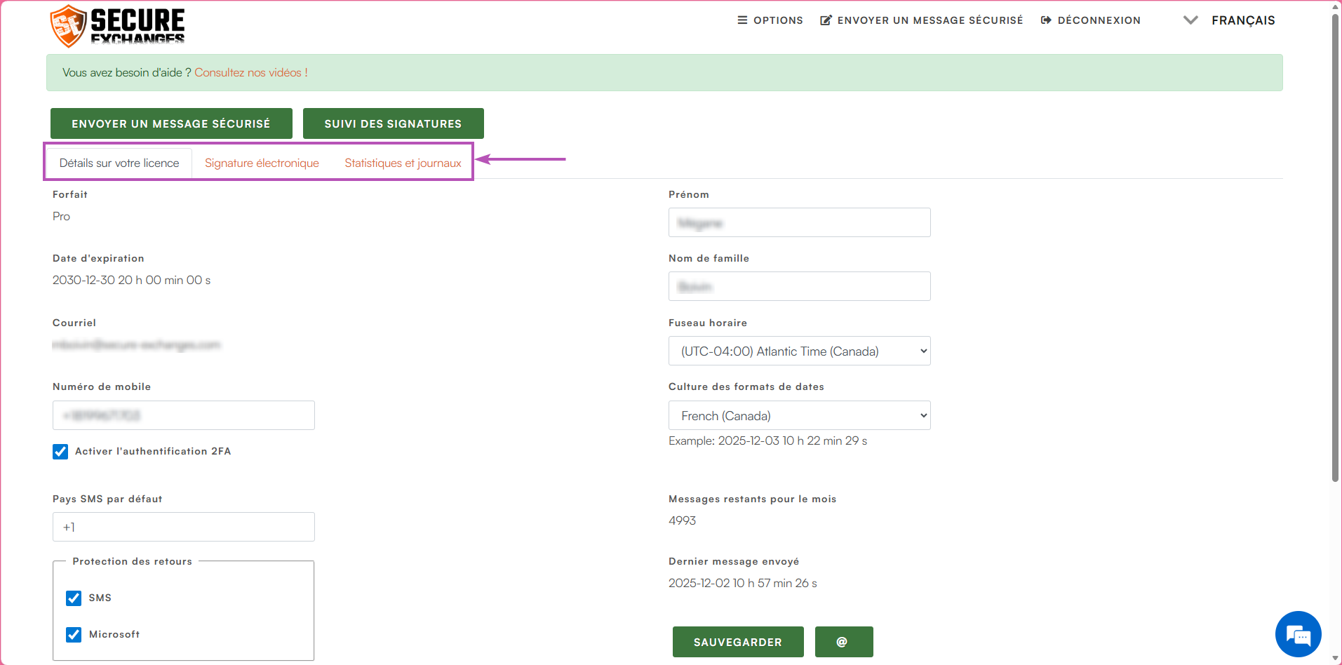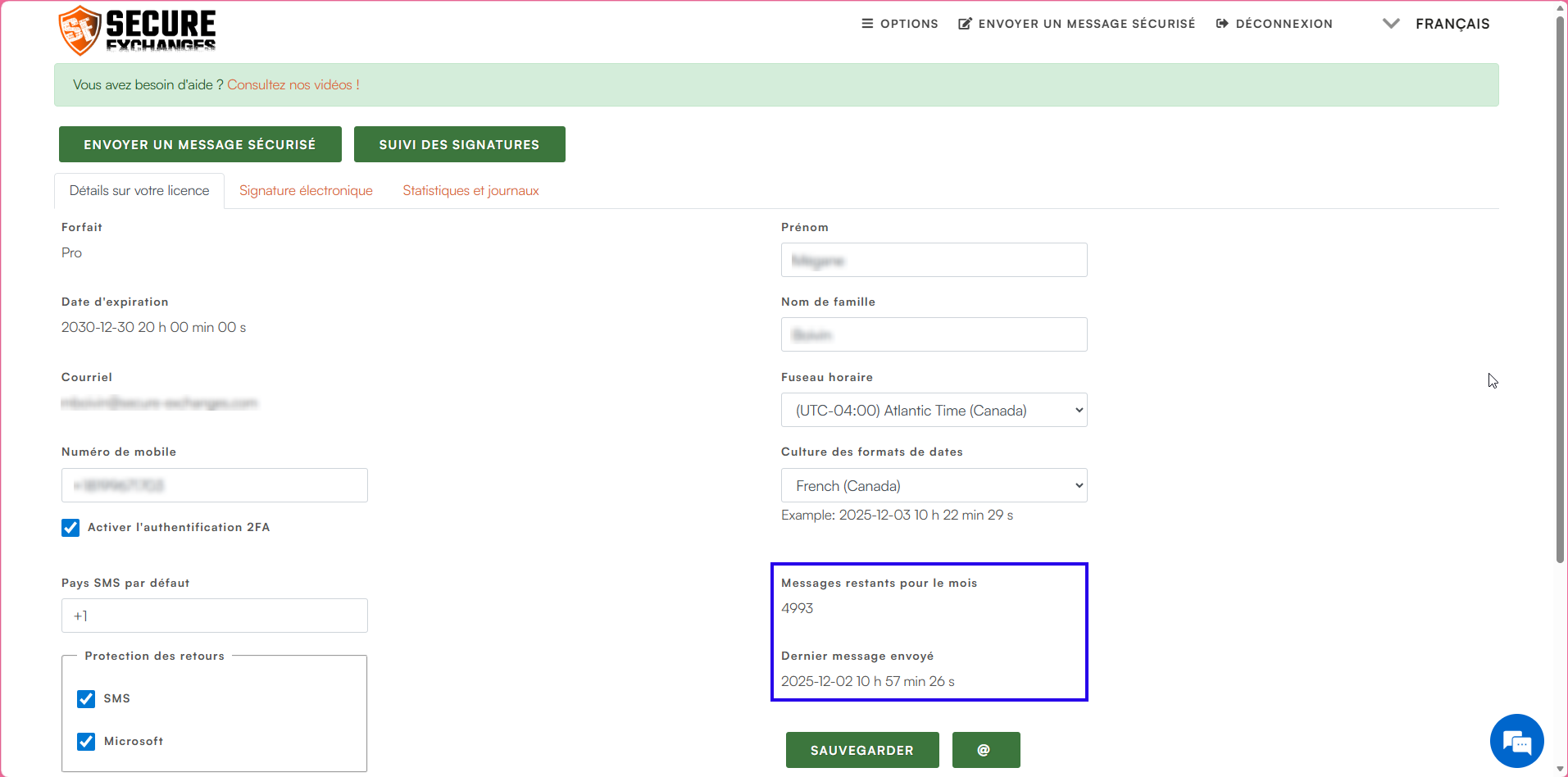 - Dernier message envoyé *Affiche la date et l’heure de votre dernier envoi via Secure Exchanges.