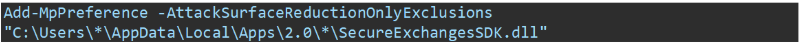 Add-MpPreference -AttackSurfaceReductionOnlyExclusions "C:\Users\*\AppData\Local\Apps\2.0\*\SecureExchangesSDK.dll"